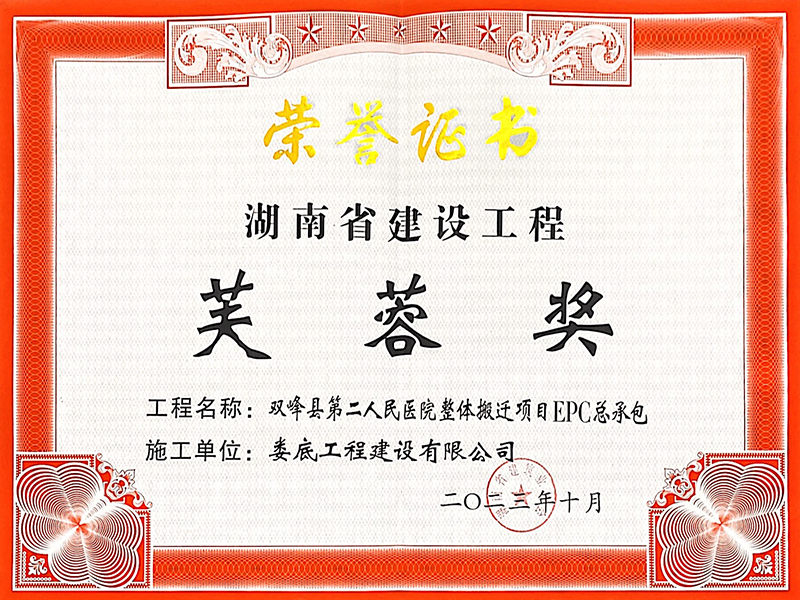 2022年度雙峰縣第二人民醫院整體搬遷EPC總承包項目芙蓉獎榮譽證書
