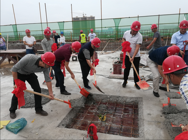 2018年5月23日,公司在江龍灘基地隆重舉行綜合樓主體封頂儀式。莊勝集團有限公司總裁周建和先生,湖南湘中礦業(yè)集團有限公司總裁楊克偉先生、副總裁劉璐先生親臨基地現場表示祝賀。公司高管在集團副總裁兼婁底工程建設有限公司董事長張愛慧先生的帶領下,共同揮鏟,為大樓主體封頂添上最后一斗混凝土。